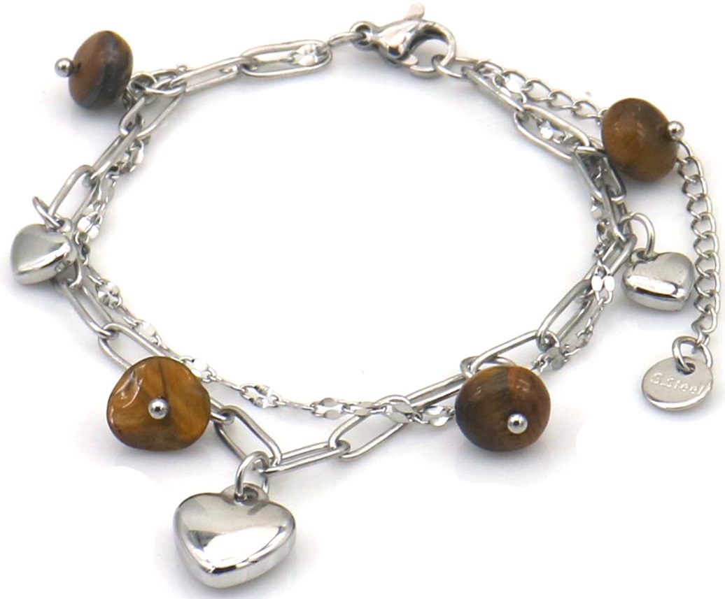A-B22.3 B2583-032S-3 S. Steel Bracelet Hearts - Stones 16-21cm Brown