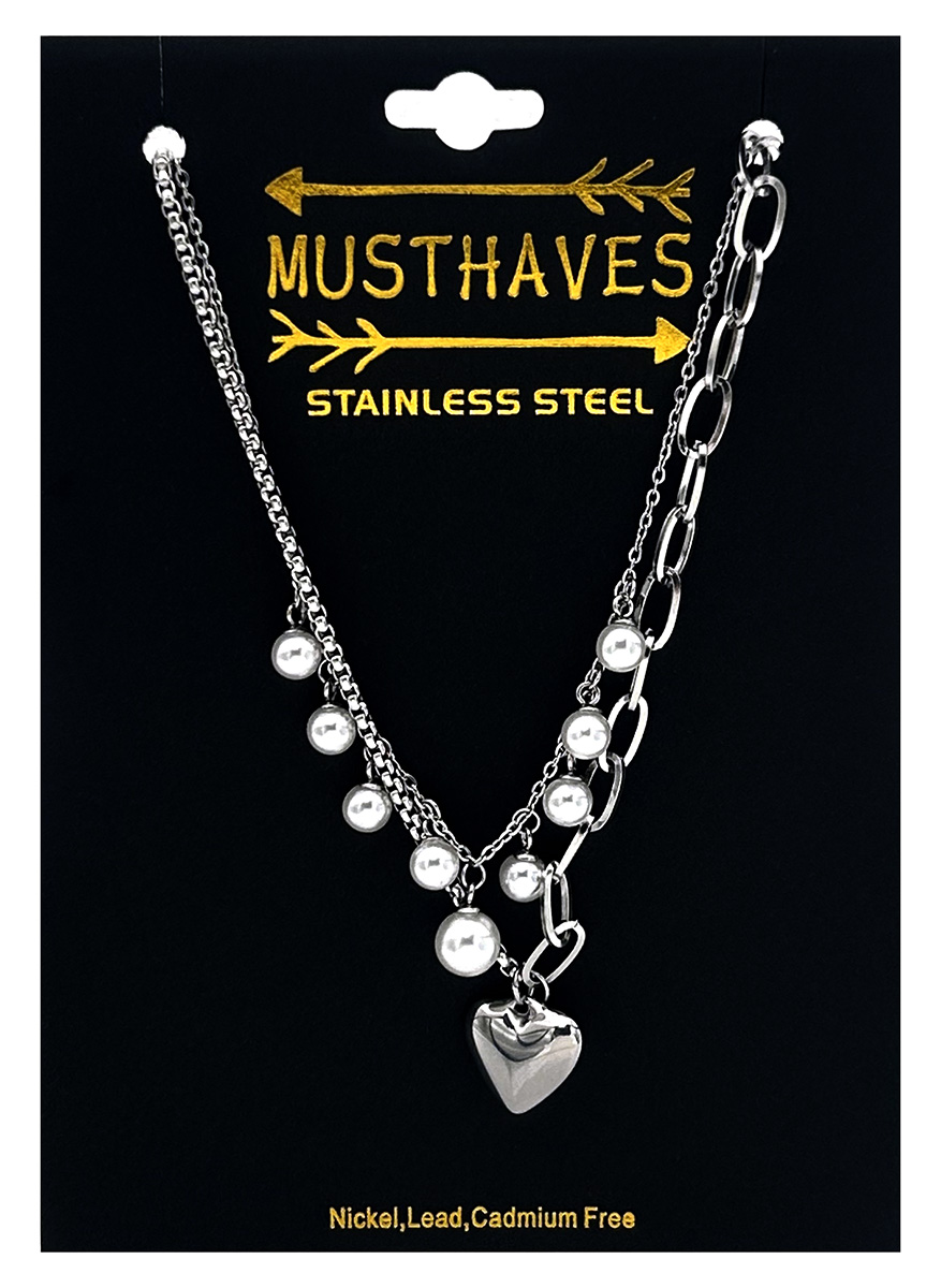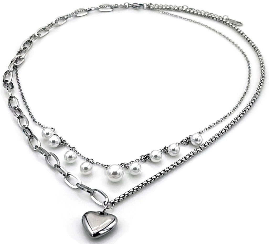 C-E11.2 N1131-003S S. Steel Necklace Layered Heart - Pearls