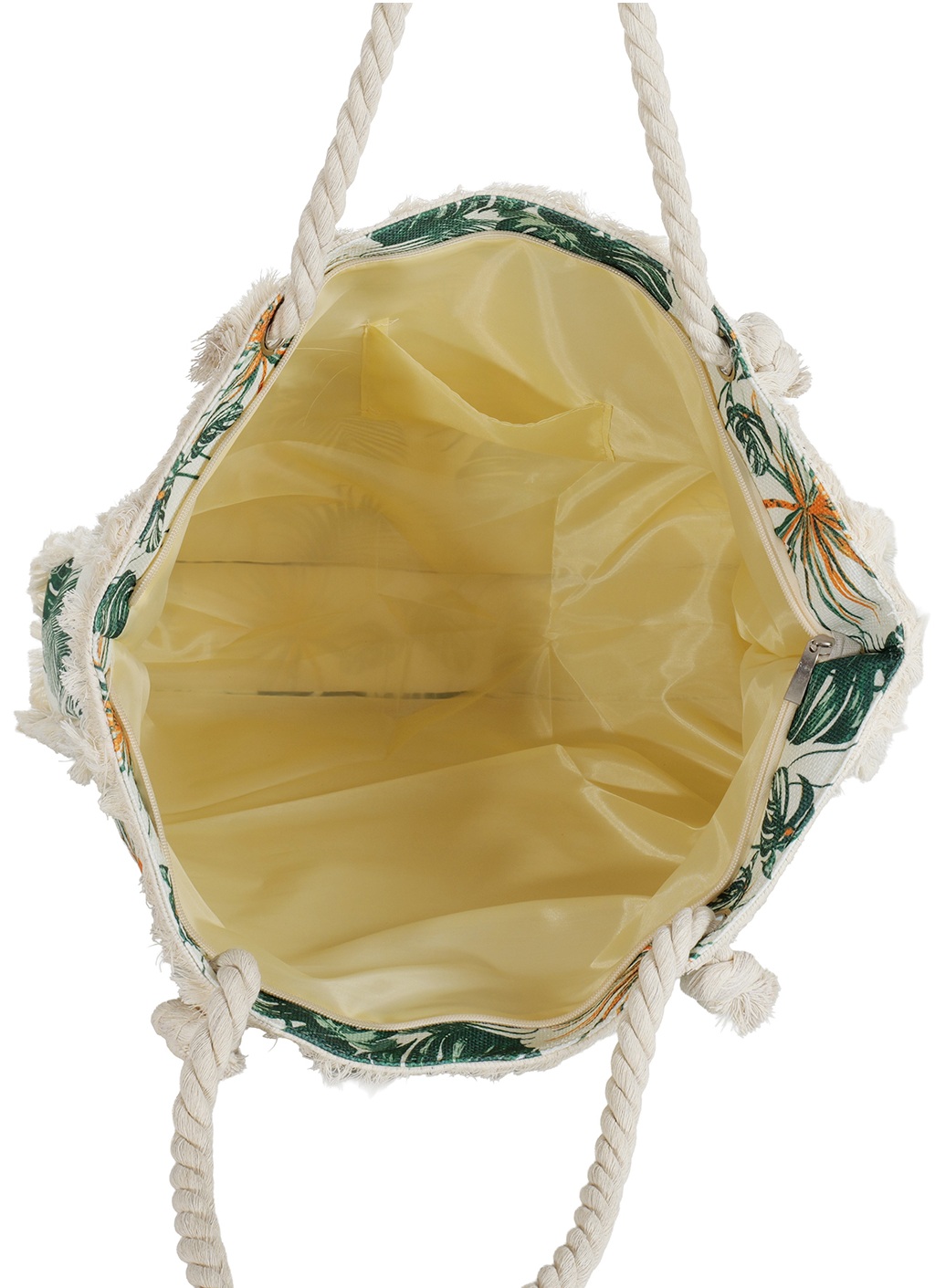 Maak kennis met de R-A2.1 BAG1111-003-3 strandtas met kwastjes, het perfecte accessoire voor je zonnige avonturen aan zee! Deze stijlvolle tas heeft een afmeting van 50x40x10 cm en heeft een levendig groen ontwerp versierd met een prachtig bladpatroon, waardoor een vleugje natuur wordt toegevoegd aan uw stranduitjes.