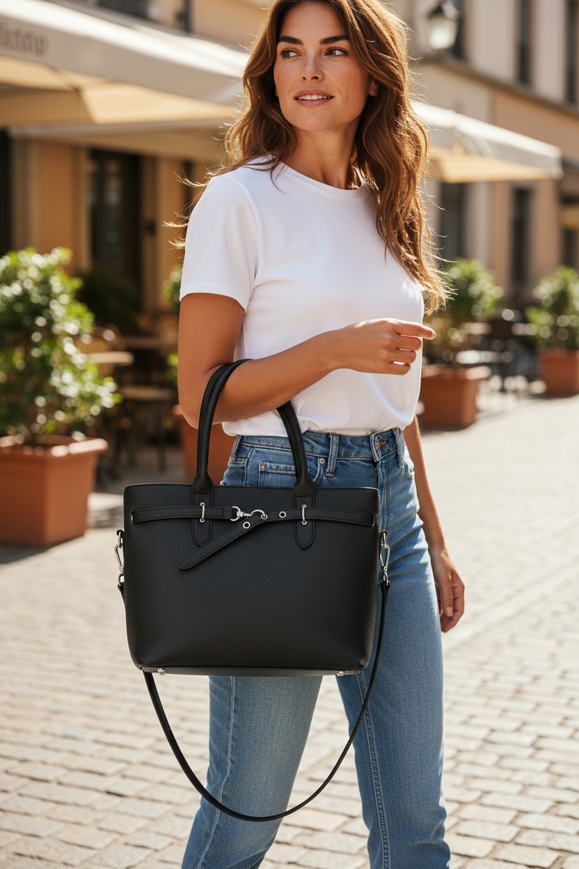 Met comfortabele handvatten en een verstelbare schouderband biedt deze tas meerdere draagmogelijkheden voor uw gemak. De lichtgewicht constructie zorgt voor gebruiksgemak, terwijl de chique zwarte afwerking een vleugje elegantie toevoegt aan elke outfit.